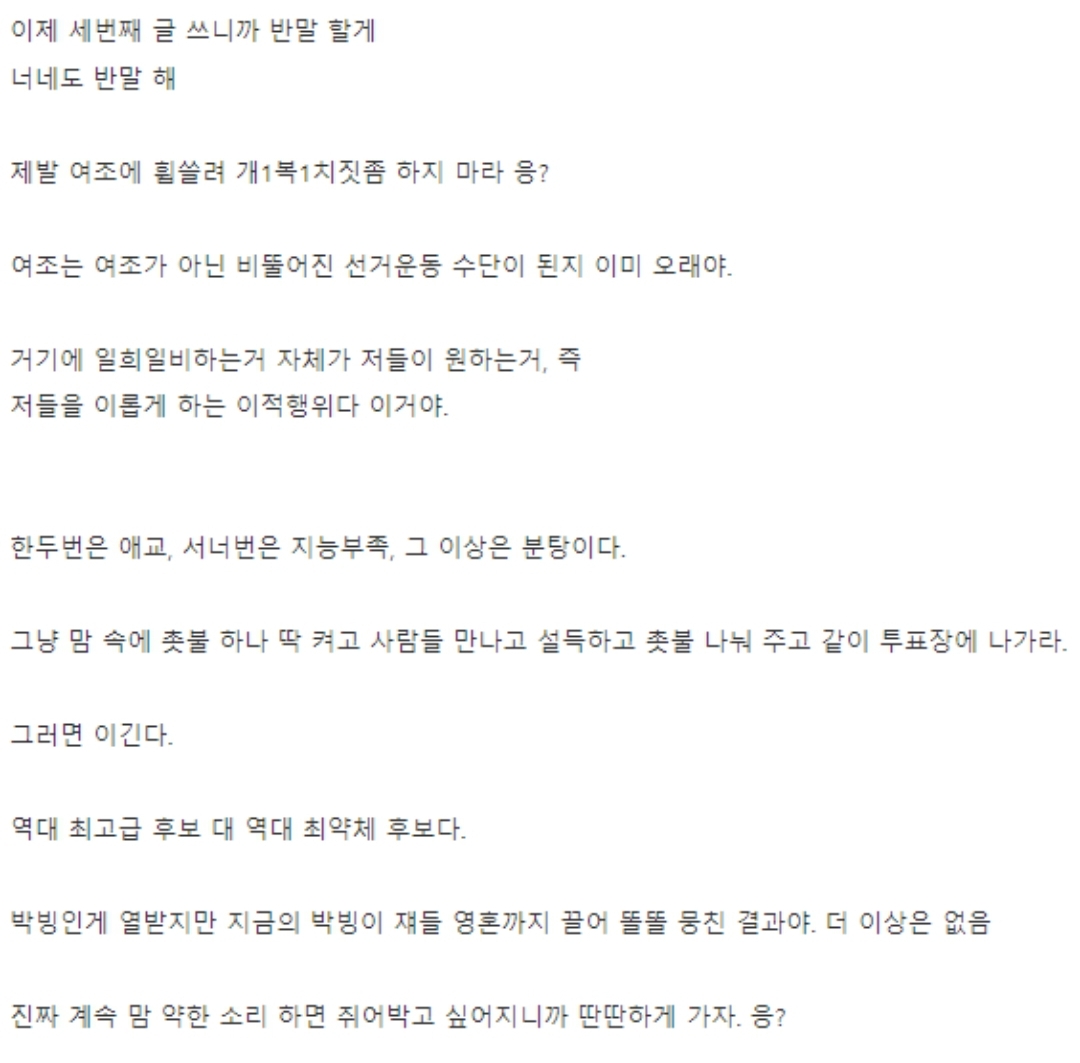 특히 그는 이번 대선을 "역대 최고급 후보 대 역대 최약체 후보(의 대결)"이라고 평가하면서 "박빙인 게 열받지만 지금의 박빙이 쟤들 영혼까지 끌어 똘똘 뭉친 결과다. 더 이상은 없다"라고 강조했습니다.
